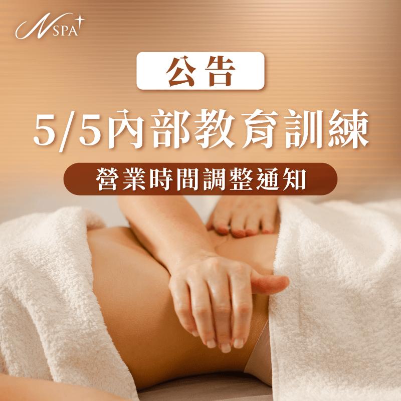 N SPA將於4月與5月進行教育訓練,專業升級是為了提供更優質按摩服務,期待帶給您更深層舒壓體驗。
